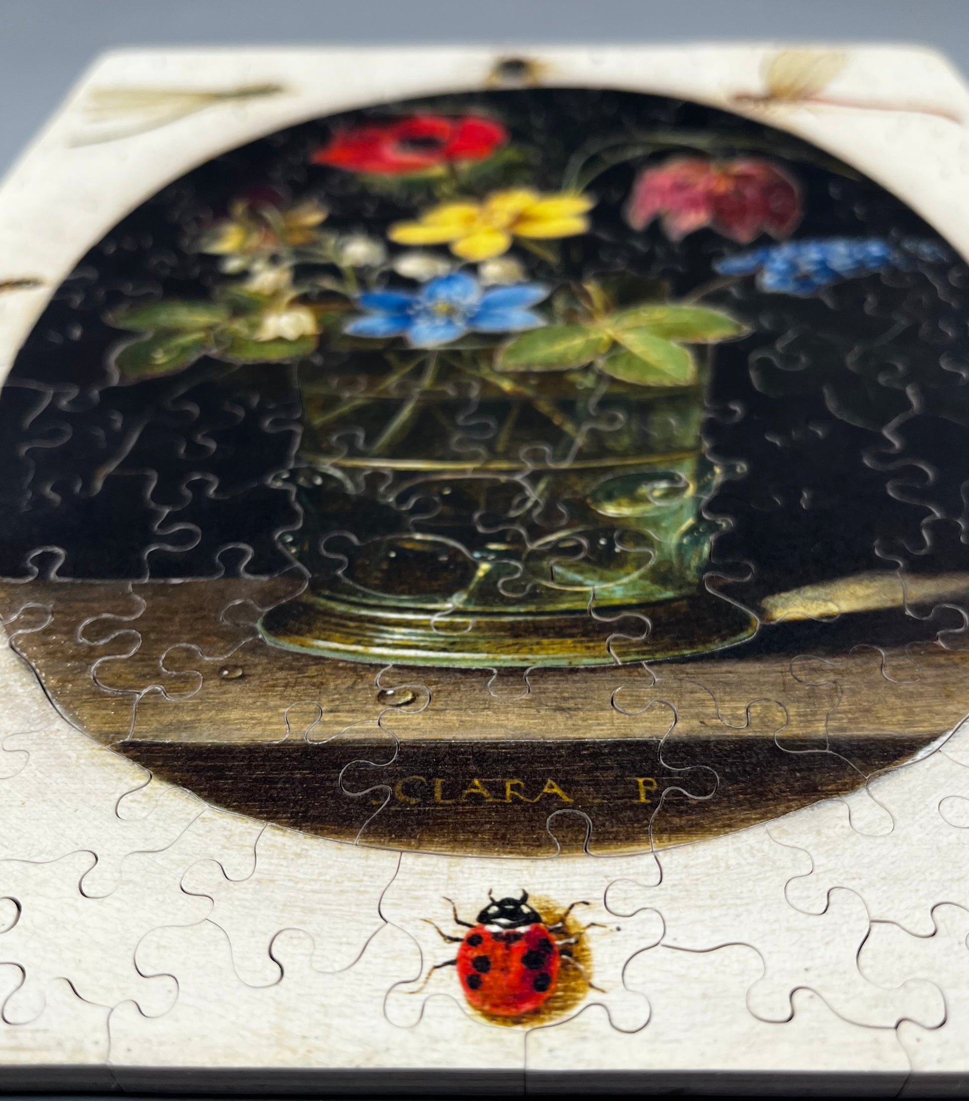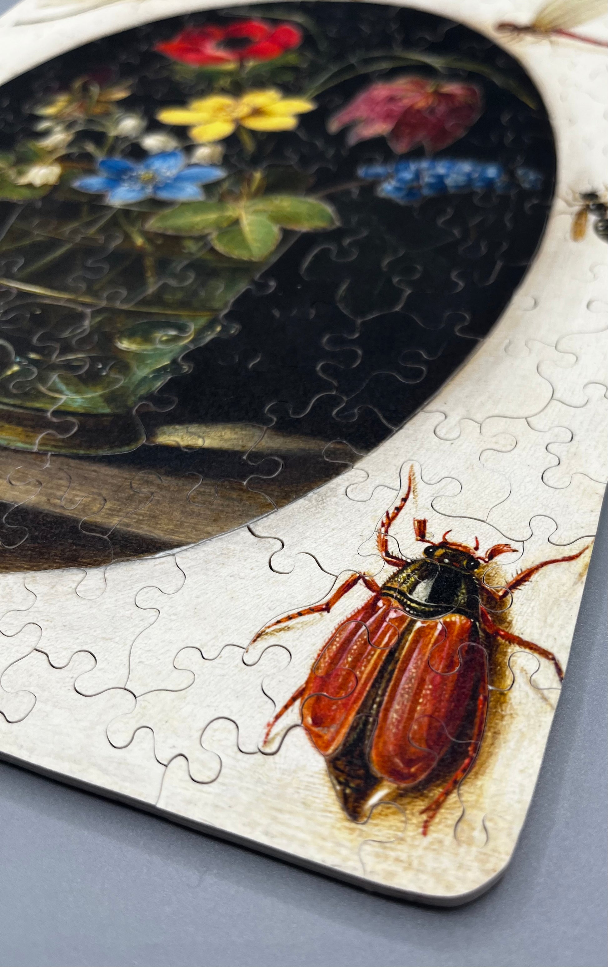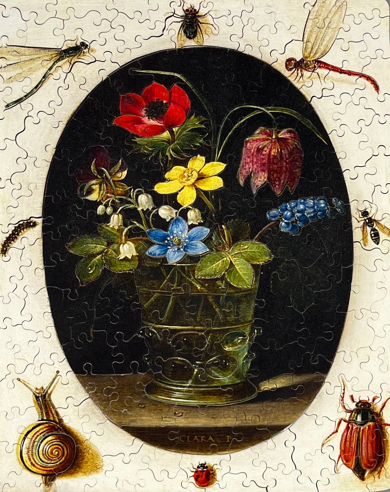 Indulge in the beauty of this exquisite puzzle, featuring a vibrant still life of flowers with intricate details of surrounding insects and a charming snail.