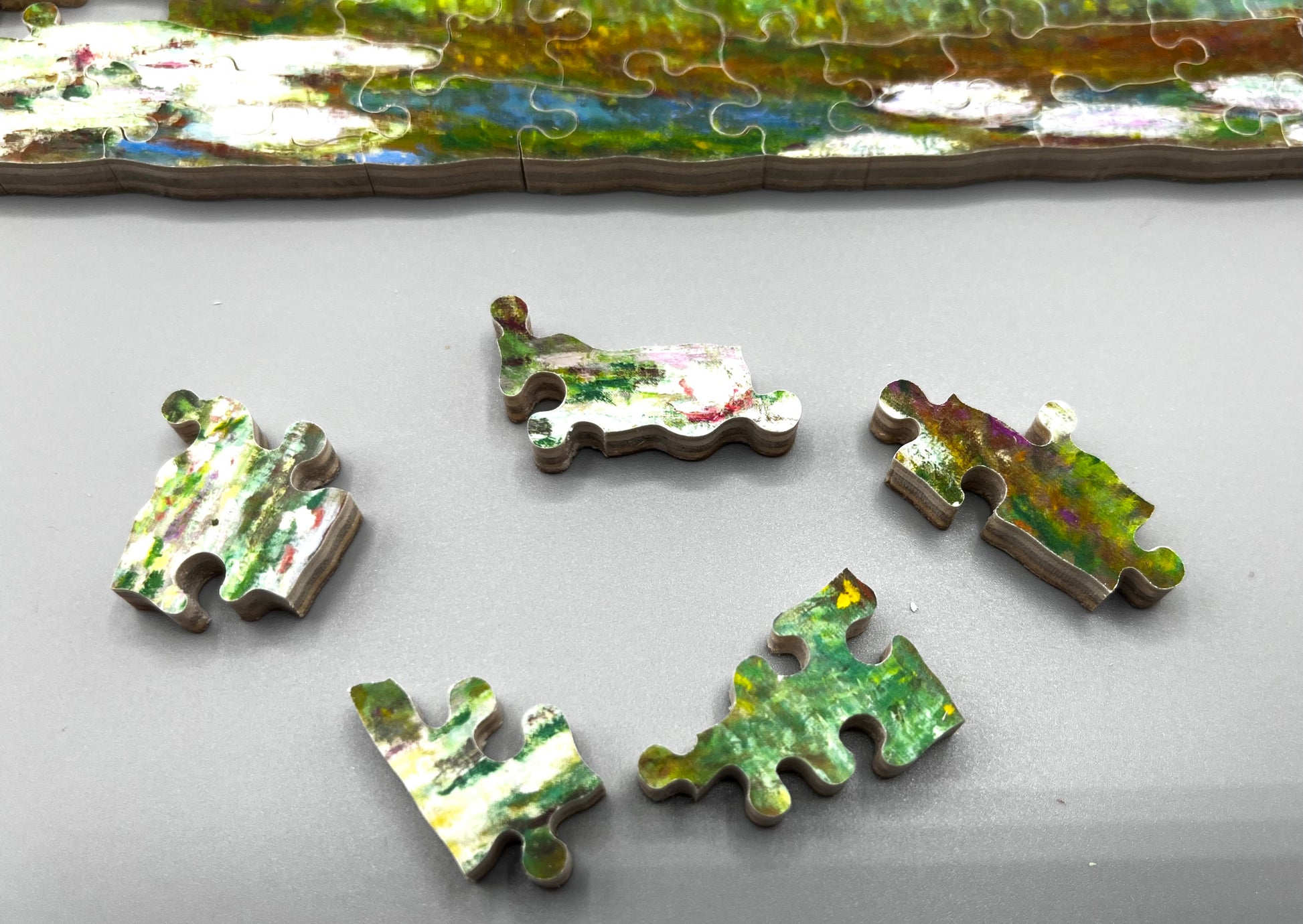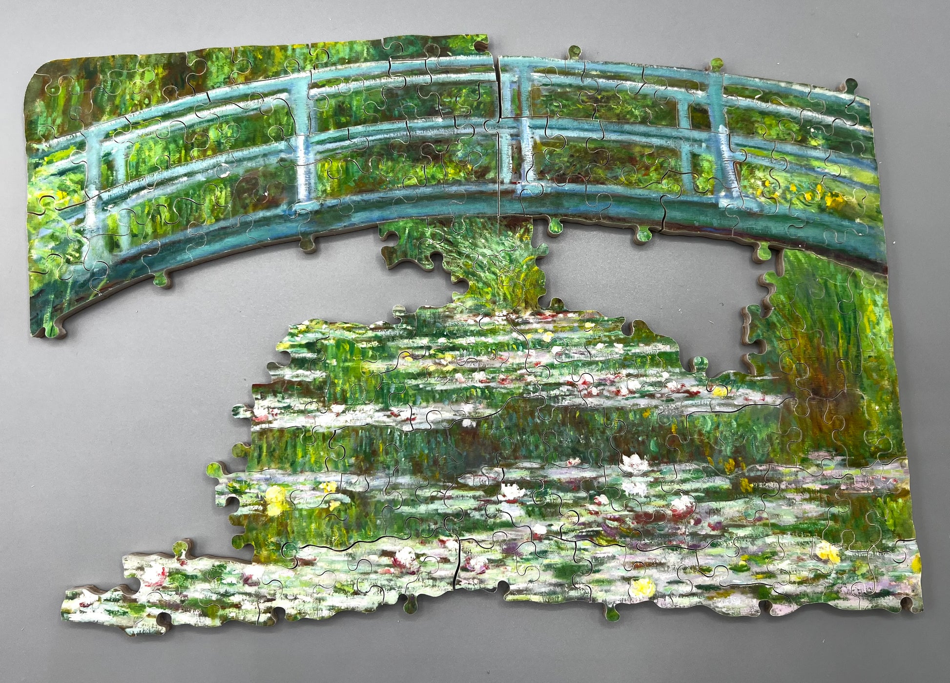In 1899, Monet painted 12 works from a single vantage point, focusing on the arching blue–green bridge and the microcosm of his water garden. Among the 12 works was the National Gallery's Japanese Footbridge. Monet designed and built the landscape that appears in the painting—from the bridge to the pond and its shape, to the water lilies and other plantings. The artist, who as a leader of the impressionists had espoused the spontaneity of directly observed works that capture the fleeting effects of light and color, had in these later paintings subjected a nature he re–created to sustained, meditated scrutiny.